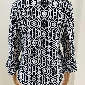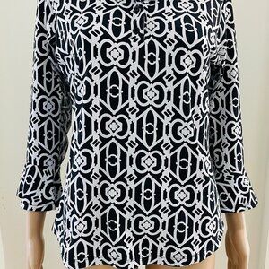 IBKUL 1/4 Button Pullover Top 3/4 Sleeve Mesh Black White Abstract Women Size M