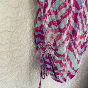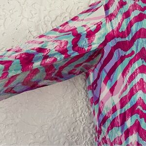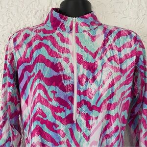 This is in good used condition with an allover zebra like print in a pink, white, blue, and purple color way.