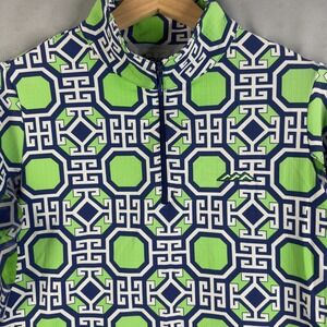 IBKUL Long Sleeve Polo Blue Green Geometric Women's Size M 1/4 Zip UPF 50+