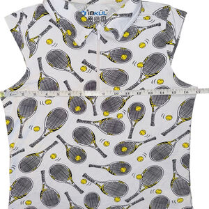 This is a pre-owned IBKUL sleeveless top, size S. The garment features a white background with an all-over print of tennis rackets and yellow tennis balls. It has a collared neckline with a partial zipper closure. The material composition is 92% nylon and 8% polyurethane. The top appears to be in good condition with no immediately visible imperfections. Made in Indonesia.