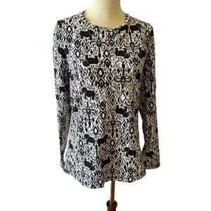 Size Small, black and white elephant and geometric print, pull on, long sleeves, mesh underarms, UPF 50+ sun protection.