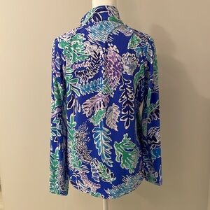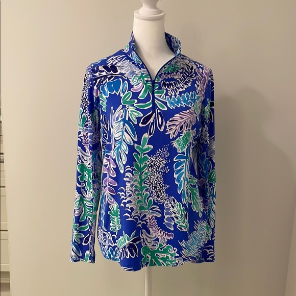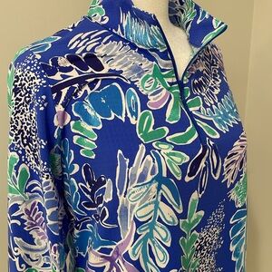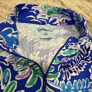 1/4 mock zip sports top with in multi color leaf print. The top fabric had UPF + 50 sun protection and patented IceFil technology to help keep you cooler- what this brand is known for! Excellent condition. Size M.