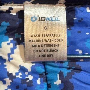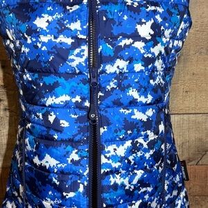 IBKUL women's Polartec, Power Fill, blue camo print, quilted vest in a size Small. Performance apparel with UPF sun protection. Front features a double zippered front closure to allow versatility on how to wear the vest. Zippered side pockets. Inner drawcord for an adjustable fit. Pre-loved great condition.