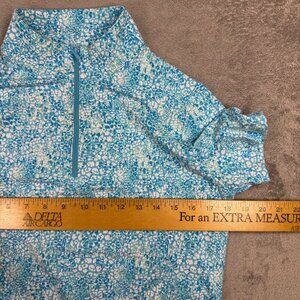 Featuring a vibrant blue and white abstract print, this short sleeve polo is designed with a mock neck quarter-zip front and advanced UPF 50+ sun protection. The fabric is lightweight, moisture-wicking, and quick-drying to keep you comfortable during any activity. Perfect for golf, tennis, pickleball, walking, or casual wear.