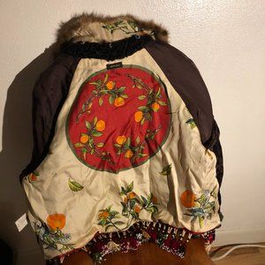 Limited collection Ibrigu jacket/parka made with intricate embroidery on wool with silk interior-- black fur is polyester but the neck is real.