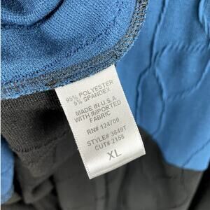 Stretch knit tunic top in a black and blue color block. Round neck, long sleeves, front pocket. 95% polyester, 5% spandex. Size XL