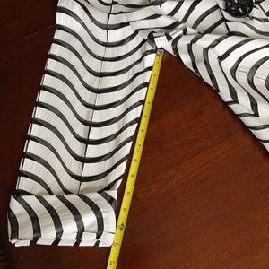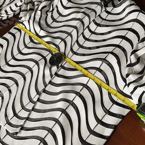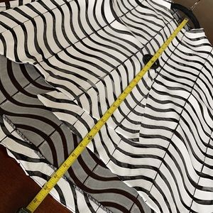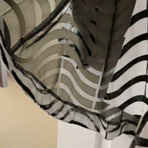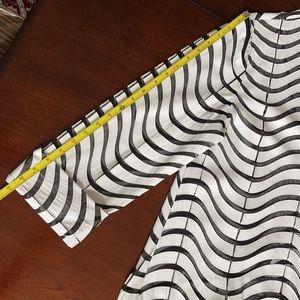 See through black mesh.High neckline.Elbow cuffed sleeves.Stripe motif.Asymmetric hemline.One button closure.Approx. 29" length.