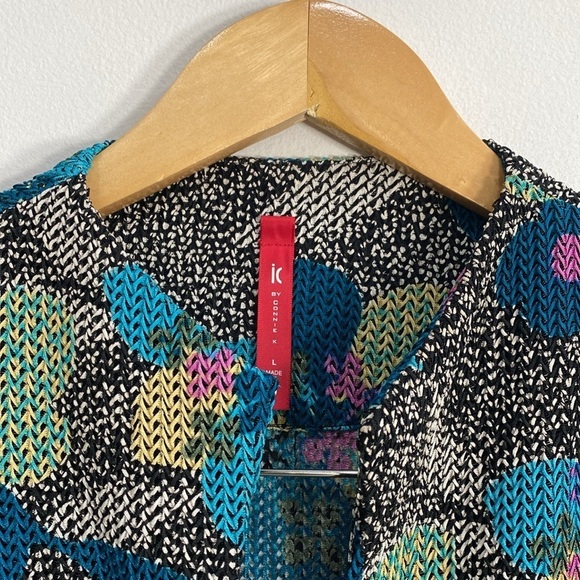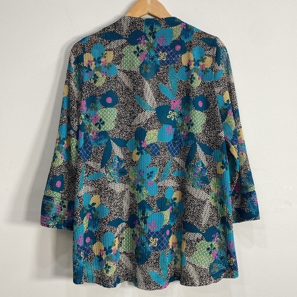 asymmetrical open knit jacket with 3/4 Sleeves and a one button closure