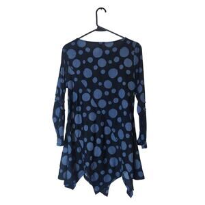 IC by Connie K art to wear asymmetrical long sleeve tunic, women's size small. Black with all over blue polka dots.