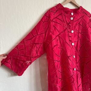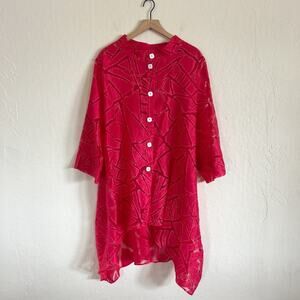 IC by Connie K Long Duster Button Front Tunic Jacket 1X Red Semi Sheer Geometric