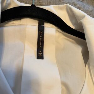Light weight beautiful white light jacket/tunic with pockets. Fun buttons and excellent details. The trim piped black on the sleeves and neck have wire in it so you can mold it to however you want the look to be