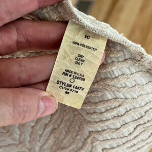 Like new knee length IC by Connie champagne duster. Wide shawl collar with two large patch pockets on front. Exotic monochrome print adds subtle texture. Has large shawl pin for wrap closure, or wear open. Easy care 100% polyester. Generous size medium. In excellent condition.