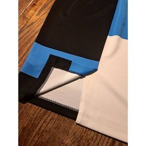 Women's ICE midi skirt in good used condition, tagged size Large. Stylish color block design in black, blue, and white. Features an elastic waistband, rear slit, and soft stretch fabric made from 95% polyester and 5% spandex for a comfortable fit.
