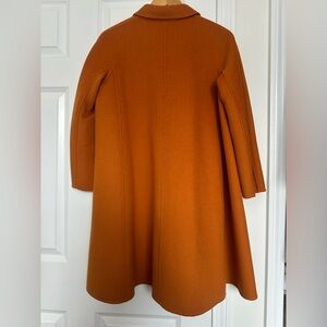 The rich, warm orange/rust/camel hue (a versatile, earthy tone that flatters most skin tones and pairs effortlessly with neutrals or bold accents) features a classic Peter Pan collar, button-front closure with distinctive ICICLE button details, three-quarter sleeves, and a flattering A-line/swing silhouette that creates graceful movement and a feminine shape—ideal for transitional seasons or layering over dresses and knits.