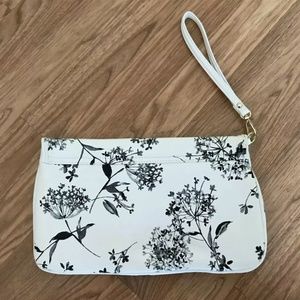 New without tags - never used! Color: white background with black/dark gray floral pattern with hints of gold; gold hardware. One small zipper pocket inside, no exterior pockets. Detachable wrist strap.