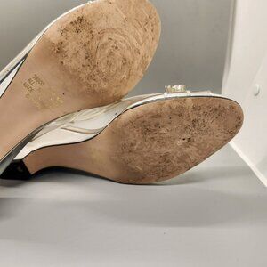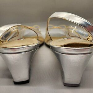 These shoes feature a clear PVC or plastic upper with a silver-toned trim and a small bow detail at the toe, accented with a gold-tone metal piece. The insole is a light beige or silver color, and the heel is a clear wedge shape. The label "I♥COMFORT" is visible on the insole of shoe. These pumps are designed for evening wear or special occasions, dating back to the 1980s