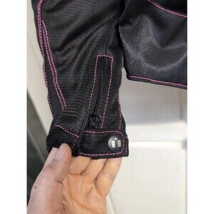 The Icon Motorsports Contra Preformance Series Motorcycle Jacket is specifically designed for women in size XS. Made from durable textile material, this black and pink jacket features a quilted lining for added comfort and warmth. It is in EXCELLENT used condition.