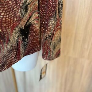 Stylish ICV top with a textured design. Features a mix of red, black, and gold colors. Perfect for adding a pop of color to your wardrobe. NWT See pics for pit to pit measurement. Perfect to wear under a cardigan for the fall winter months.