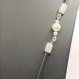 ID Badge Silver Tone and Black Cord Necklace with Ornate Metalwork