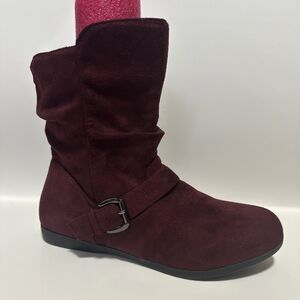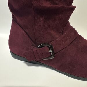These burgundy boots by I.D Required in size 11 feature a pointed toe shape, zip closure, and a flat heel. The slip-on style with an ankle shaft and adjustable strap make them perfect for casual occasions year-round. The faux suede outsole and suede lining add a touch of luxury to these red boots, making them a stylish addition to any wardrobe with a bohemian theme. Made in China, these boots are designed for comfort with a foam insole and standard shoe width, making them a versatile and trendy choice for any season. she used to have some imperfections on them. Theres a little bit of scuffing on the side of both shoes. There is a mark on the left shoe near the foot and there is glue residue on the back of the left shoe.