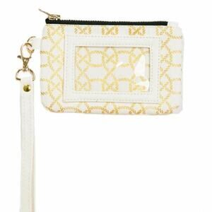 Elevate your style and organization with this chic wristlet that holds your ID, cards, and cash. The clear exterior pocket makes it easy to display your ID, while the detachable strap allows for versatile carrying options. The I.D. Wristlet is made from luxurious vegan leather in a Cream White shade, adorned with a stunning gold design.