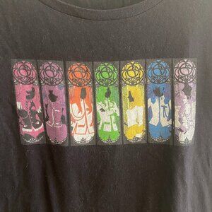 Black short sleeve crew neck T shirt with image of characters from anime Revolutionary Girl Utena.