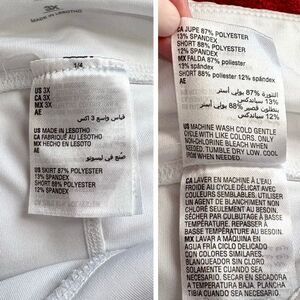 IDEOLOGY makes this Performance Flounce Skort I Ladies size 3X. The color is "Bright White". MSRP $29.50. Hit the court (or anywhere) looking fresh in this tiered pull-on skort from Ideology. Created for Macy's. It's the perfect choice for outdoor sports and activities, thanks to the built-in shorts, rapidly moisture-wicking fabric and a zippered pocket at the back waist for keys and other essentials. The skirt is 87% polyester and 13% spandex. The built-in shorts are 88% polyester and 12% spandex. Machine wash in cold and tumble dry on low. The waist circumference is 42" (without stretching), it's 17" long and the inseam on the shorts are 6". This is super cute and NWT!