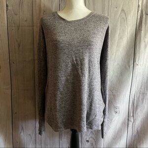 This sweatshirt is in good condition with normal signs of wear. It does have the size tag cut out but has the side one still in tact. It has the thumb hole as shown for comfort during a workout. It is 69% rayon, 27% polyester and 4% spandex. It is machine washable. These are great for working out or just a casual day out with leggings.