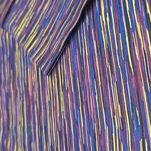 Colorful pullover with striking stripes. Features purple, pink, and gold tones. Ideal for casual outings.