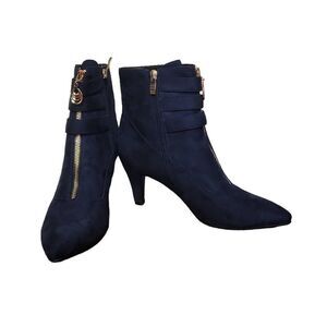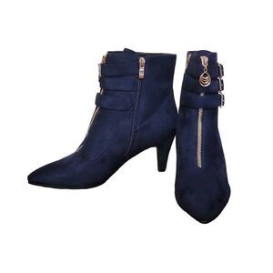 These are navy blue suede IDIFU pointed toe heeled boots with gold colored zipper accents and 3 buckles at the ankle.