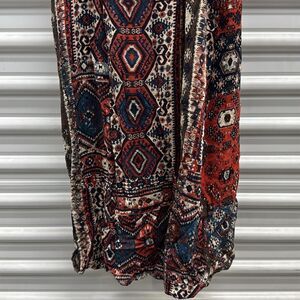 Embrace a bohemian vibe with this colorful patchwork dress. Perfect for any occasion, this dress features a mix of red, blue, and brown tones. Stand out with its unique design and vibrant colors.
