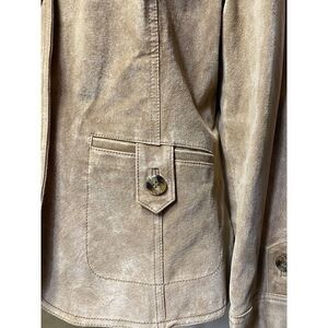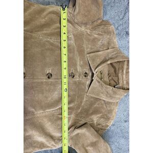 Vintage i.e. relaxed suede leather jacket/blazer in a golden tan, light brown color. Has button closure, collar, long sleeve with button accent, and two pockets with button closure. This is a Preowned vintage jacket, it has wear to it. Leather clean only. In good condition for vintage. As seen in last photo leather marks on front chest of jacket. No holes or rips. Check measurements in pictures for sizing. Size Large