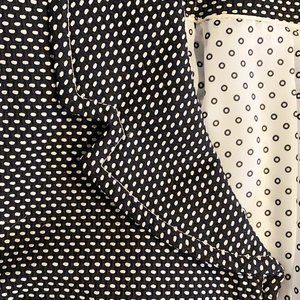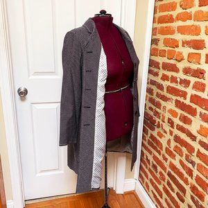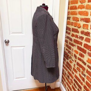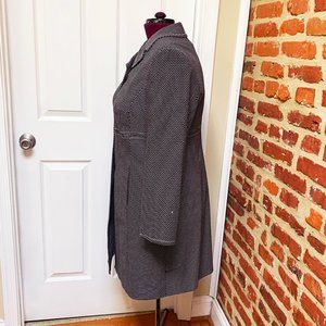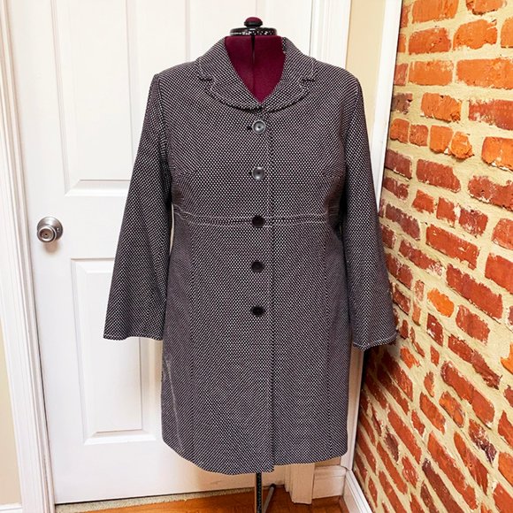I.E. Woman coat, size 1x. Black fabric with white embroidery. White topstitching. Mid-length. Seamed waist. Princess seams. Notched lapel. Long sleeves. On-seam slash pockets. Rear kick pleat. Contrasting white & black lining.