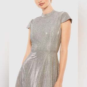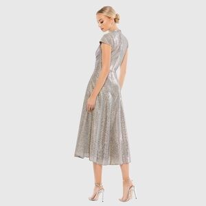 Sparkling metallic silver tea-length cocktail dress with a high neckline, cap sleeves, and a midi-length a-line skirt.