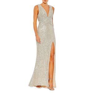 Form-fitting column gown with a beautiful rhinestone-embellished collar, seaming detail at the natural waist, and a leg-baring front slit.
