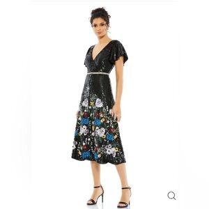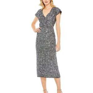 Whatever the dress code calls for, you can bet sequins will be a bright idea. This dazzling sheath is cut from shimmery round sequins that cover the dress from its single flutter sleeve down its knee-length hem. Tailored with a curve-hugging fit, the dress is finished with a slim waist-defining ribbon and a chic front slit.