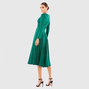 Long sleeve satin cocktail midi dress with a plunging neckline and ruched waist.