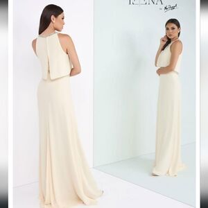 Faux two-piece, chiffon high neck gown with jewel encrusted neckline and waistband.