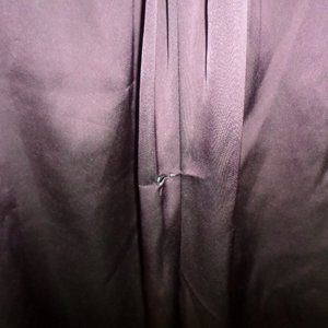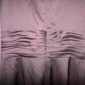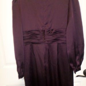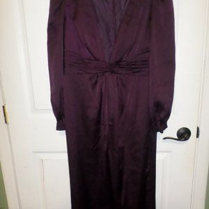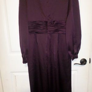 Chic long-sleeved jumpsuit in silky charmeuse completed with a plunging neckline, puffed sleeves, and ruching at the waist.