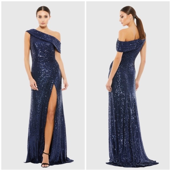 IEENA FOR MAC DUGGAL Navy Sequined Drop Shoulder Gown