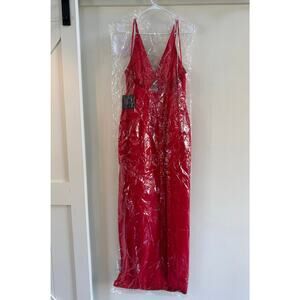 Turn heads in this sleek deep red evening gown with a fitted column silhouette and daring slit. The plunging V-neckline with keyhole cutout, delicate straps, and low open back add modern allure, while smooth polyester drapes with elegance.