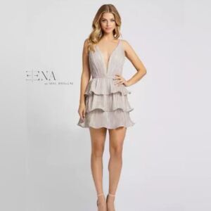 Show-stopping IEENA by Mac Duggal gown in a luminous rose pink shimmer mesh with a fully tiered ruffle skirt that transforms from full-length gown to cocktail dress. Features a plunging V-neckline, crisscross open back, slim banded waist, and flowy fit-and-flare silhouette that moves beautifully with every step. Hidden back zipper with hook closure. Elegant, feminine, and perfect for formal events or red-carpet moments.