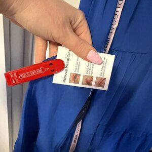 Note - The red tag on an IEENA for Mac Duggal item is not a security tag with ink; it is a "return tag" designed to prevent wear-and-return. You can safely remove it at home with a pair of scissors or by using a tool that can detach the tag, such as a strong magnet.
