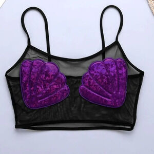 IEFIEL Sheer Mesh Mermaid Seashell Cami/Crop Top, Black/Pink, Large, NWT