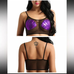 iEFiEL Sheer Mesh Mermaid Seashell Cami/Crop Top, Black/Pink, Large, NWT