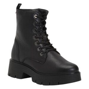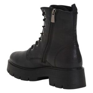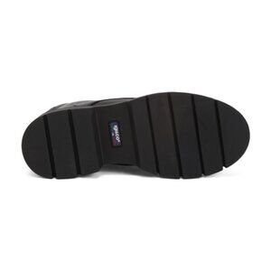pull on loop, brand logo hardware, whipstitch trim, chunky lug sole