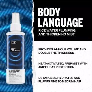 IGK Body Language Rice Water Plumping and Thickening Mist. A heat-activated, prep mist that provides 24-hour volume and double the thickness. Weightless rice water essence detangles, hydrates, and provides 450°F heat protection to prime and plump fine, thin strands.
