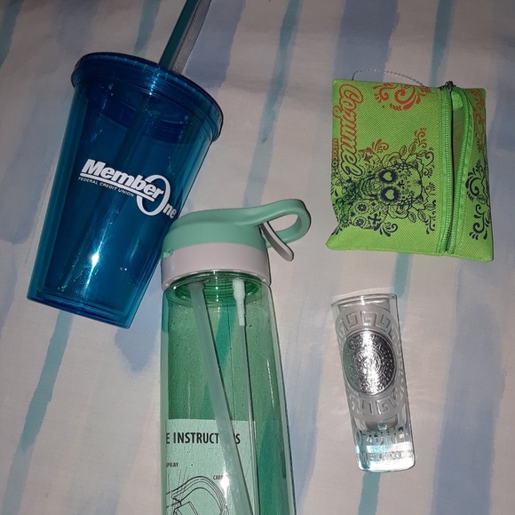 Brand new bottles and a cup. For you cup and bottle lovers out there! The blue cup still has straw sleeve on, the green one is anti-leakage as it has an on/off switch to either lock of open it and the small shot glass is a souvenir from Mexico and has a decorative sugar skull pouch to store it if you choose.