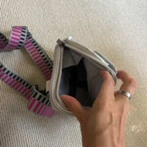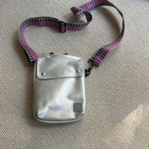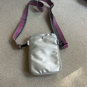 This is a new, silver-colored crossbody bag with a pink and black striped adjustable strap. The bag is made of a smooth, synthetic material and has a zipper closure. It features a small, zippered pocket on the front and a larger, open pocket on the inside. The bag is approximately 7 inches tall, 5 inches wide, and 2 inches deep. It is in new condition, but does not have tags or a box.
