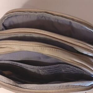 Put all your things in order in the three zip compartments of this great bag. Easy to see light lavender lining. Outside zip. Outside magnetic snap button . Inside the compartments are two zip pockets, four slip pockets, a key holder. What more could you need? Measures 10 long, 6.5 high, 3 inch deep. Clip strap is 46 long plus 9 inch extension. Excellent, like new, condition. Perfect for city our country.